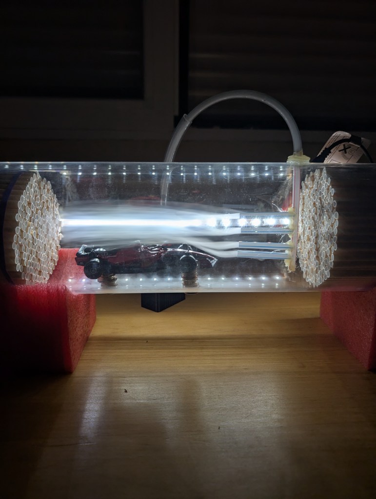 Se ensamblan todos los componentes del coche: ruedas, ejes, cartucho de CO₂ y guía central. Aseguramos que cada pieza esté perfectamente alineada y que el coche esté listo para las pruebas.